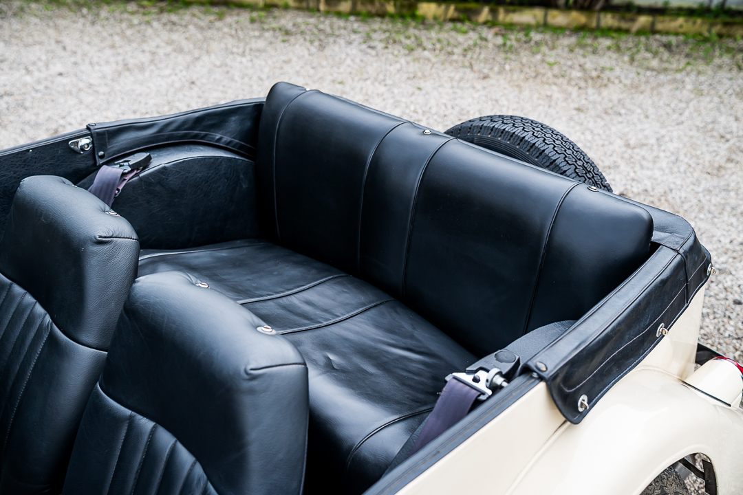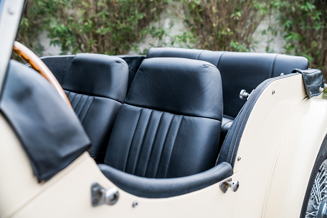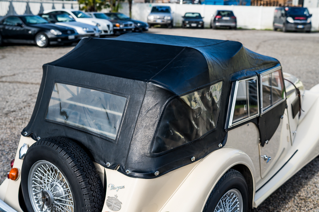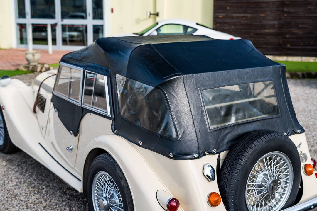 Morgan 4/4 1600 Four Seater, Old English White con selleria in pelle nera e capote nera.
