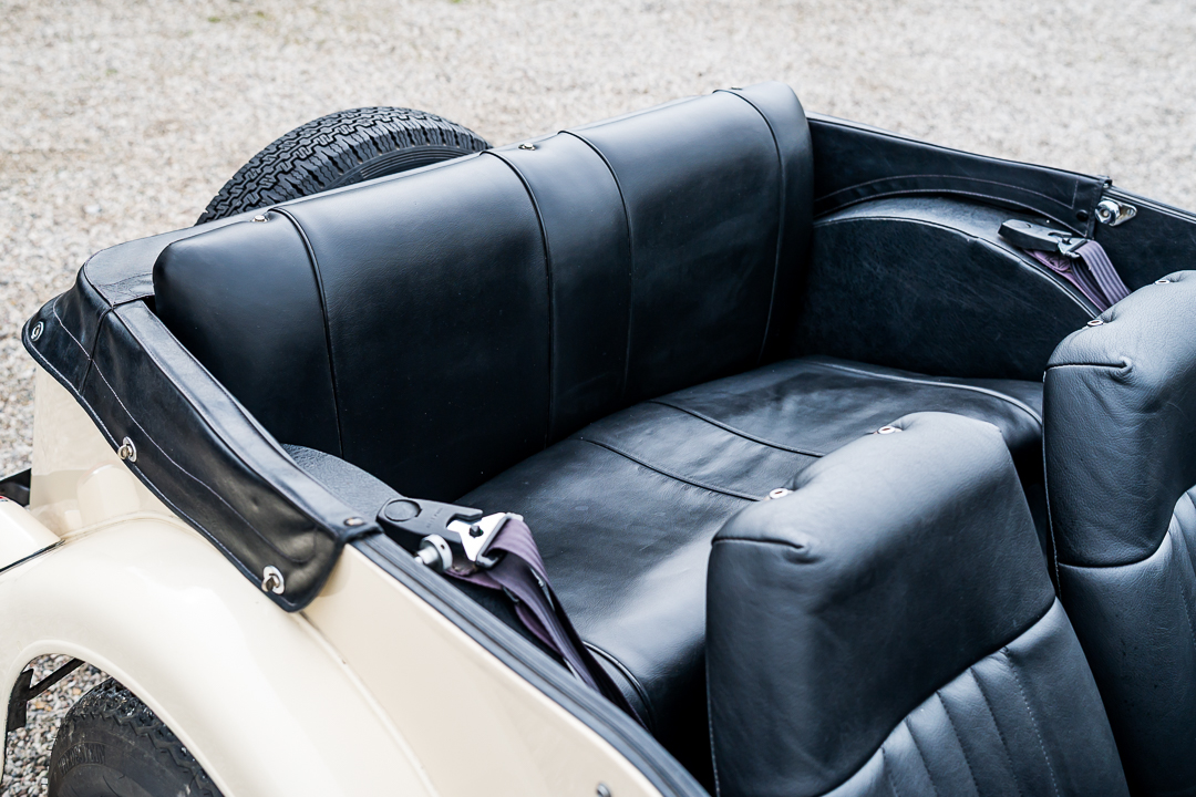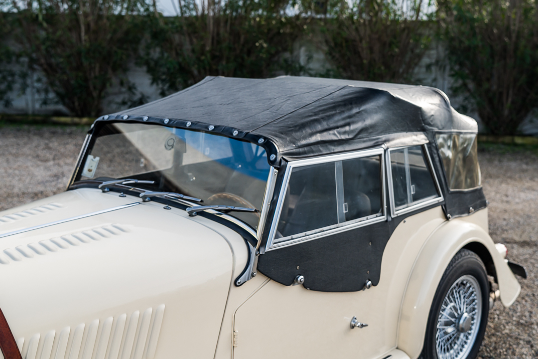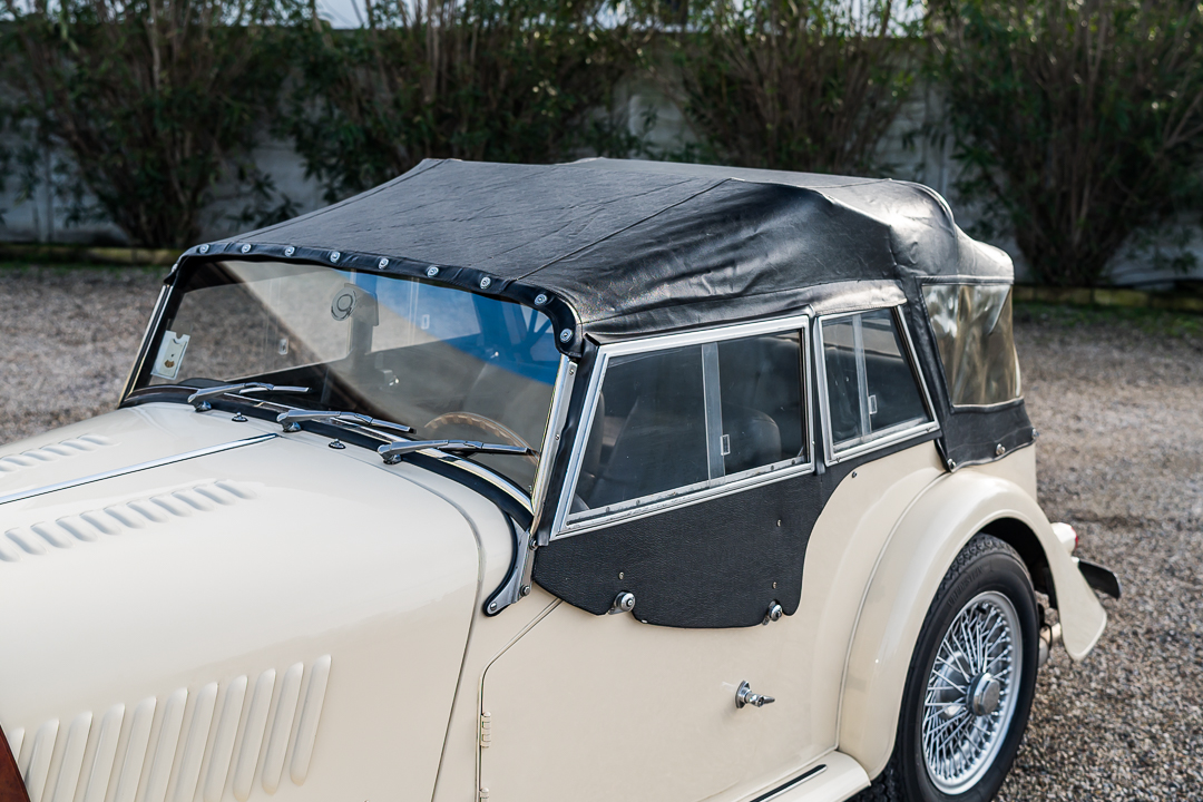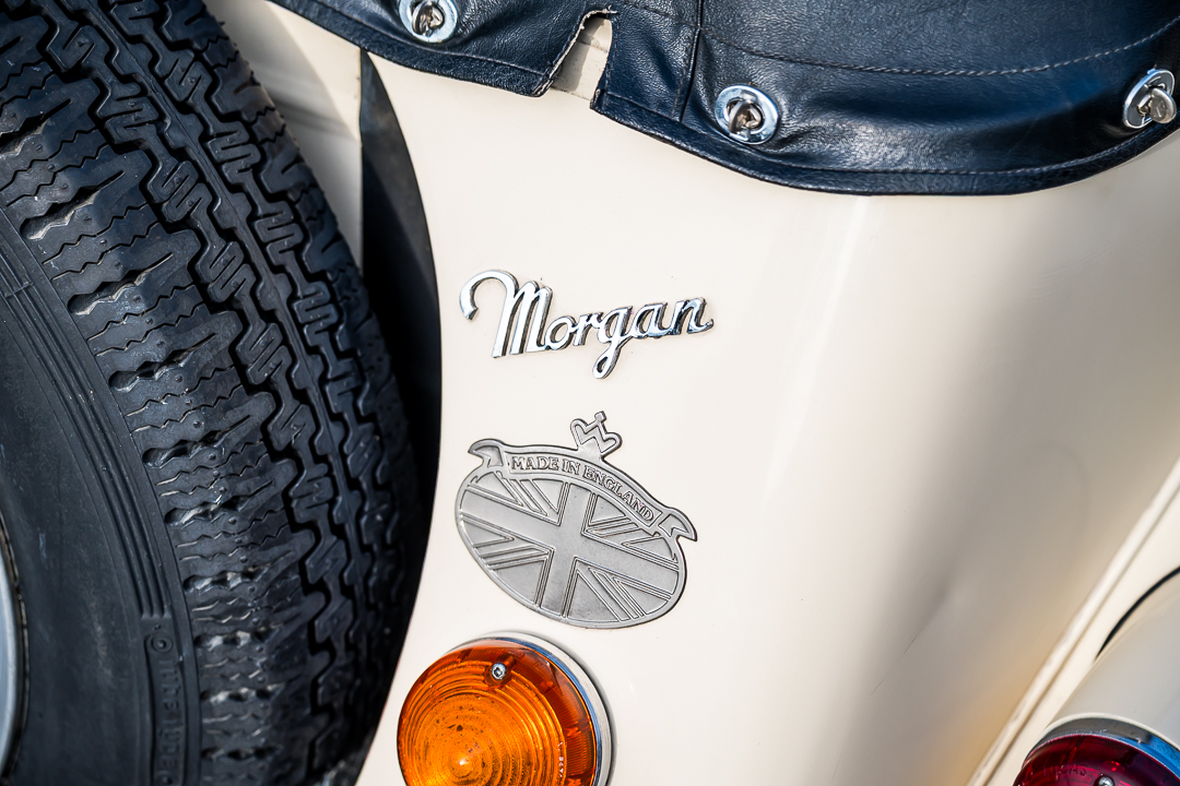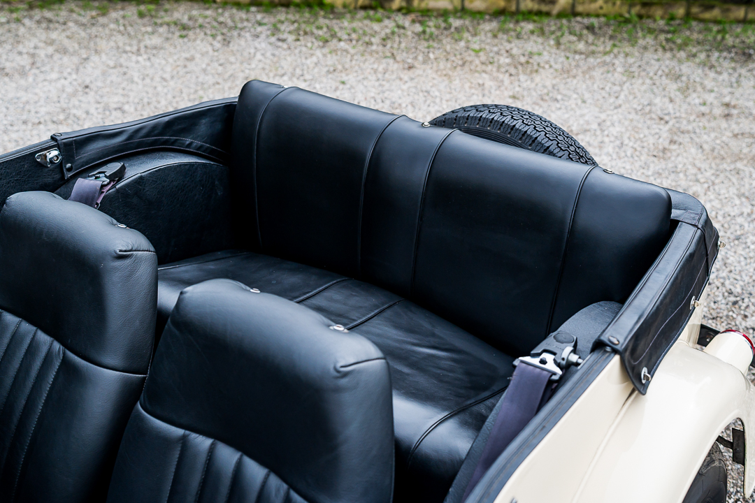 Morgan 4/4 1600 Four Seater, Old English White con selleria in pelle nera e capote nera.